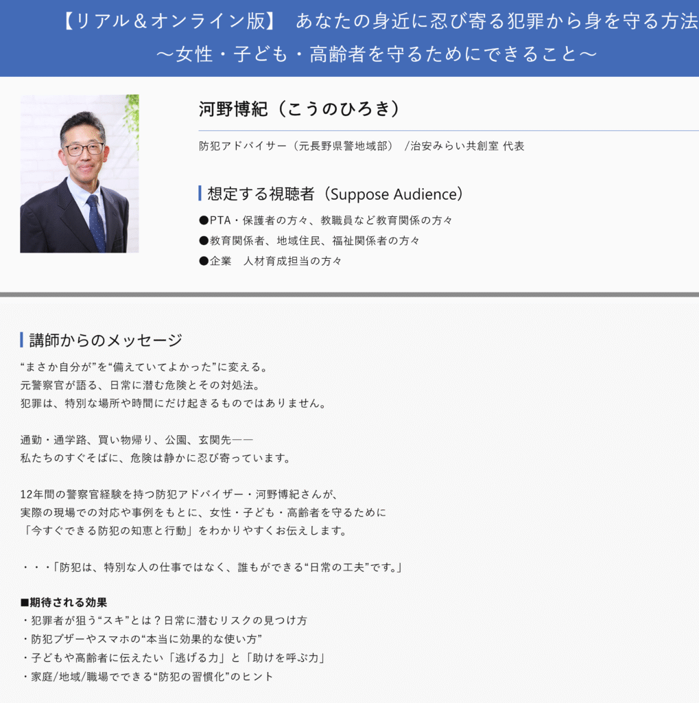 『あなたの身近に忍び寄る犯罪から身を守る方法 〜女性・子ども・高齢者を守るためにできること〜』(河野博紀さん)