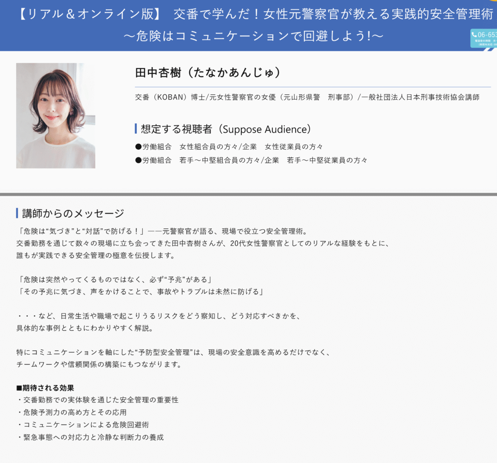 『交番で学んだ!女性元警察官が教える実践的安全管理術 〜危険はコミュニケーションで回避しよう!〜』(田中杏樹さん)