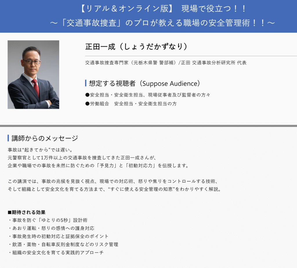 『現場で役立つ!! 〜交通事故捜査」のプロが教える職場の安全管理術!!〜』(正田一成さん)