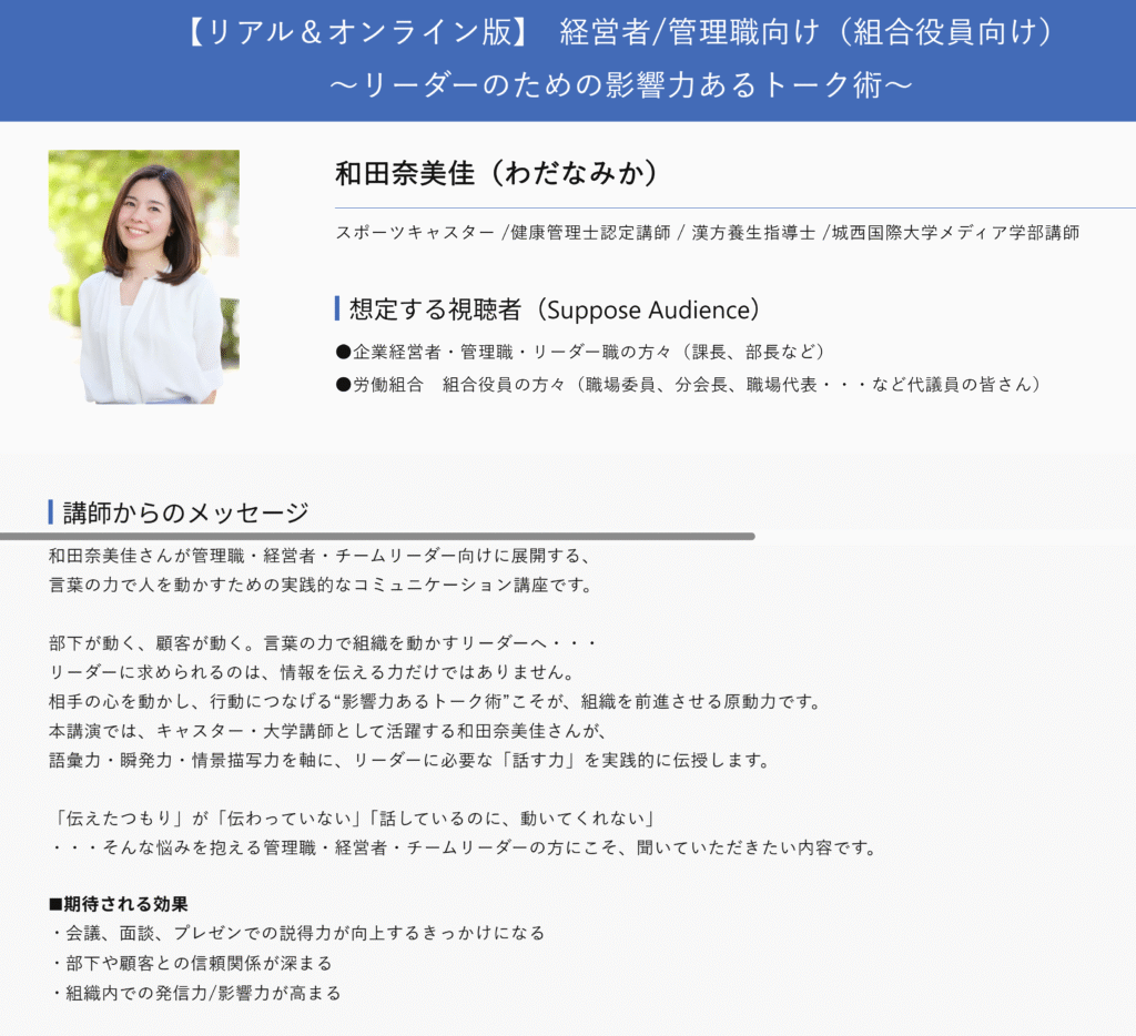 『経営者/管理職向け(組合役員向け) 〜リーダーのための影響力あるトーク術〜』(和田奈美佳さん)