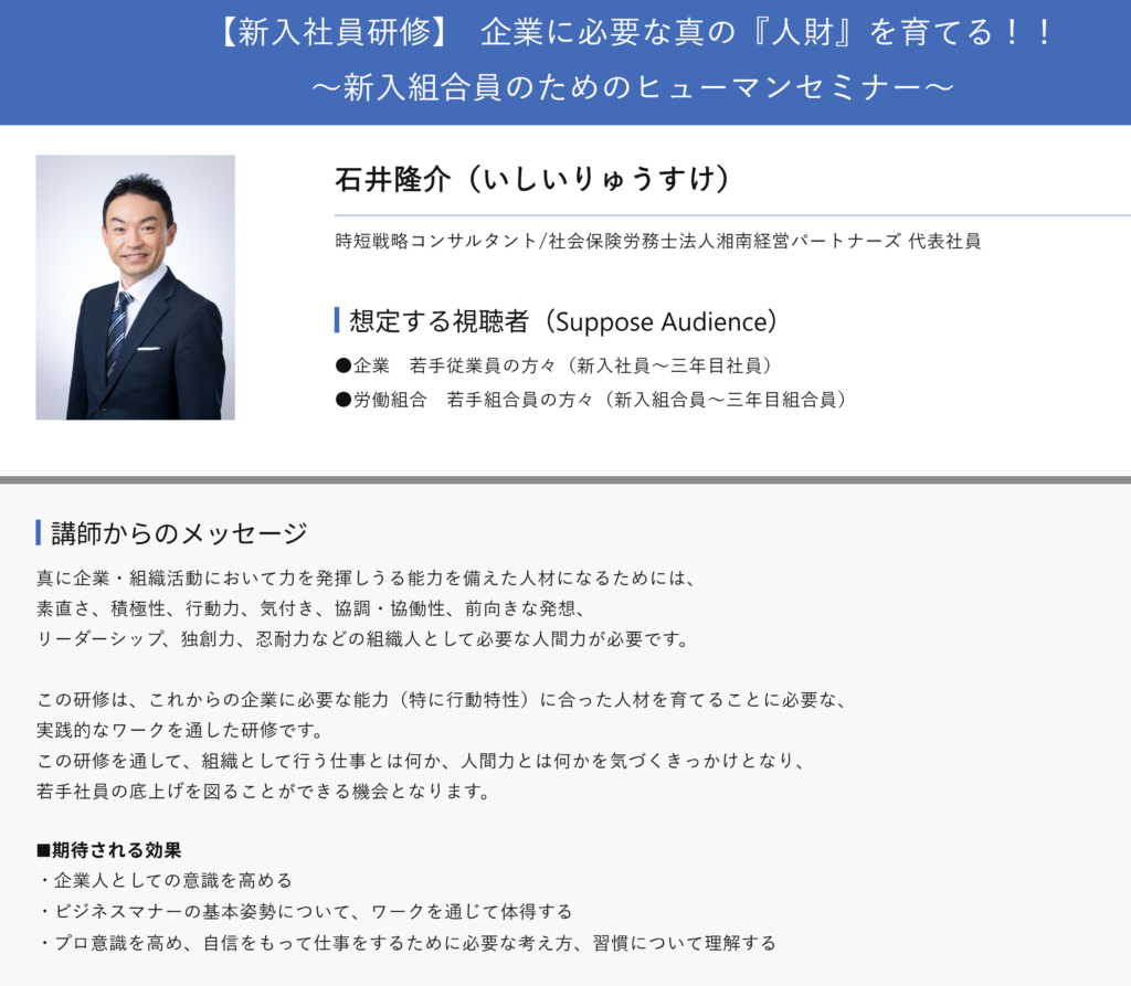 『企業に必要な真の「人財」を育てる!! 〜新入組合員のためのヒューマンセミナー〜』(石井隆介さん)