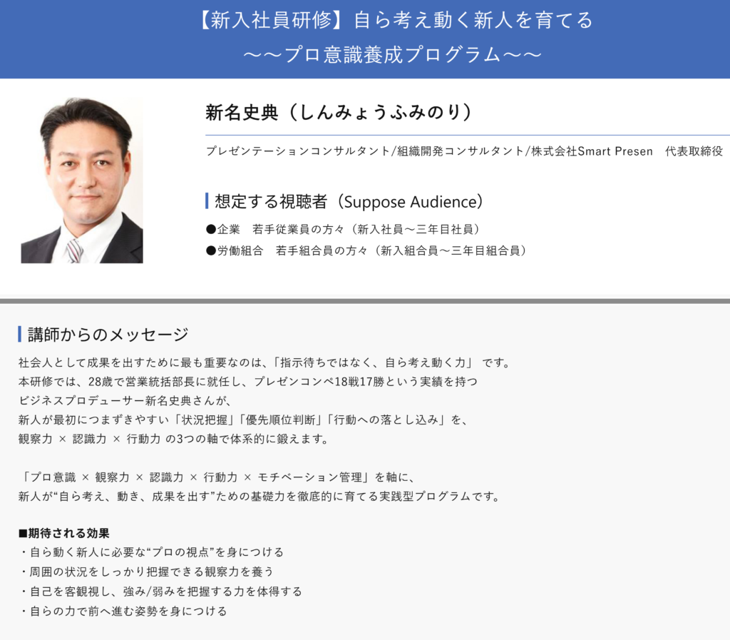 『自ら考え動く新人を育てる ~プロ意識養成プログラム~』(新名史典さん)