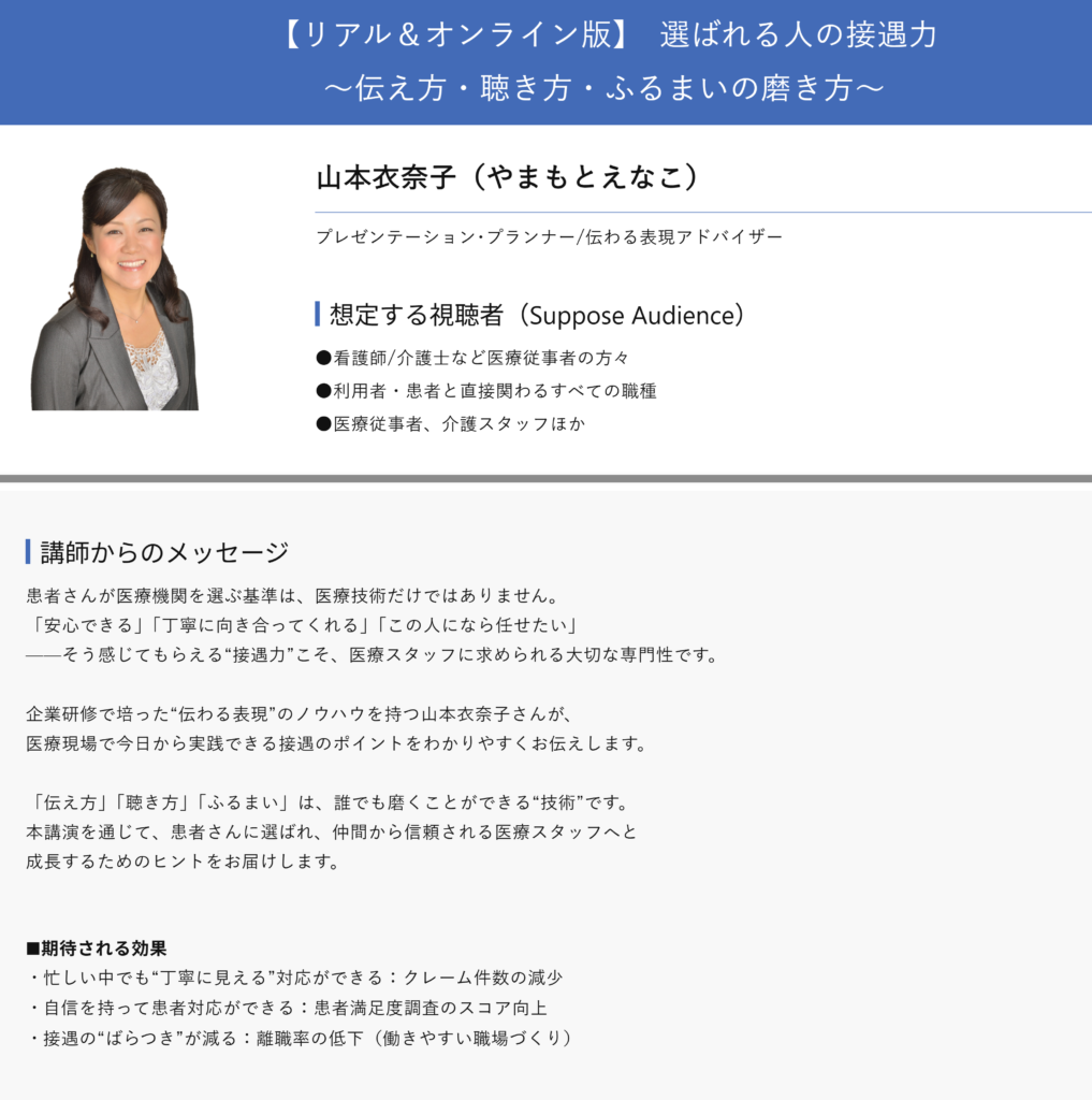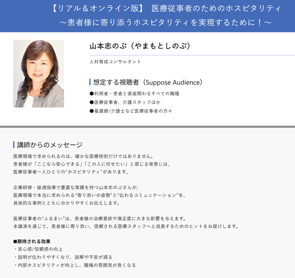 医療従事者のためのホスピタリティ 〜患者様に寄り添うホスピタリティを実現するために!〜』(山本志のぶさん