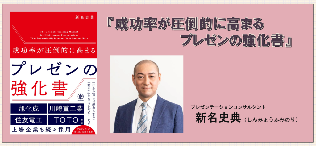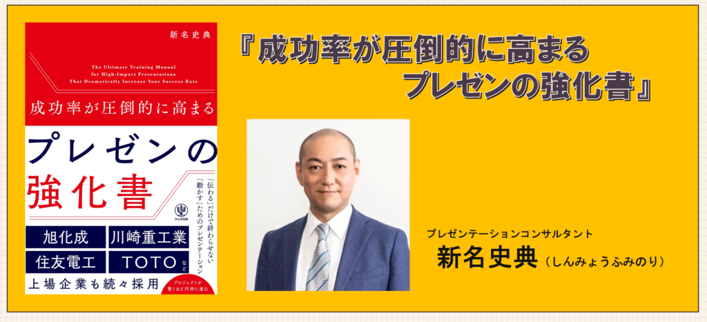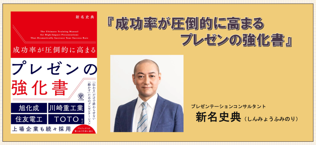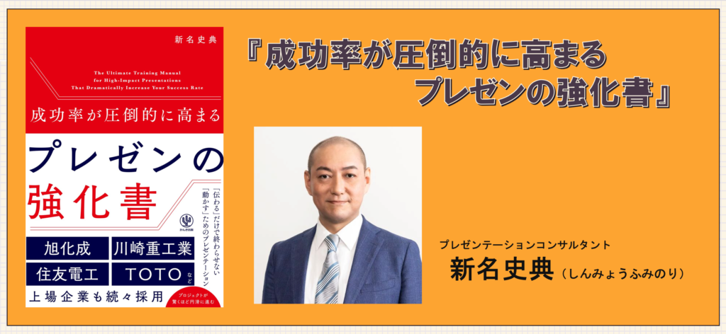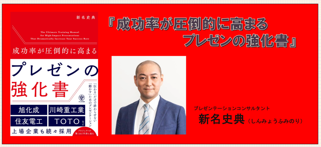 今回紹介させていただく同著は、プレゼンを「伝える」から相手を動かすレベルへ引き上げるための“提案型プレゼンテーション”の実践書です。 著者である新名史典さんは年間300日登壇するプレゼン専門コンサルタントで、信条は「ビジネスは伝わってナンボ!」で活動されており、机上の理論ではなく、実際に企業で成果が出た方法だけを体系化されているのが特徴です。