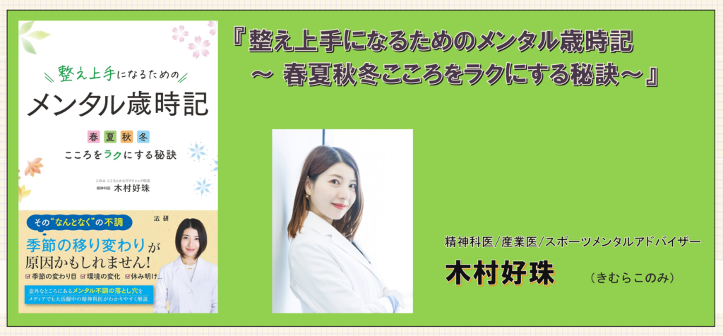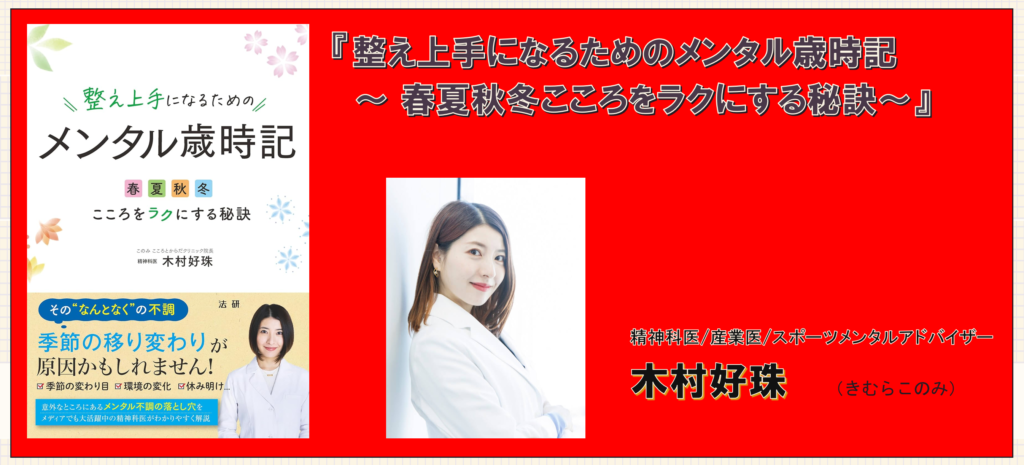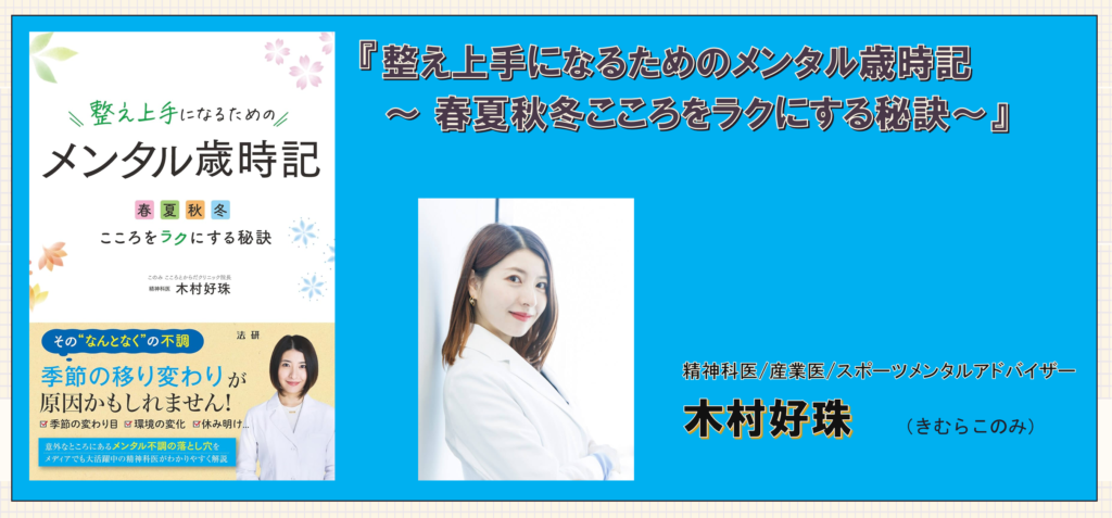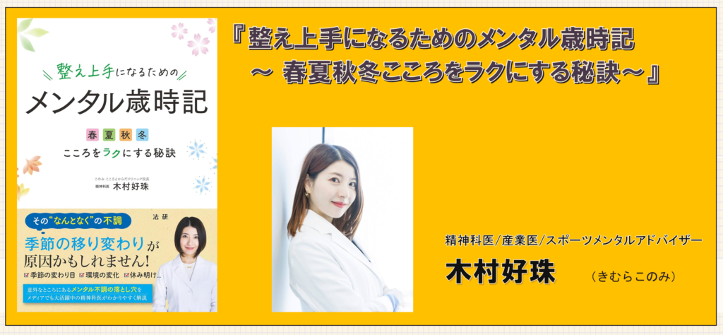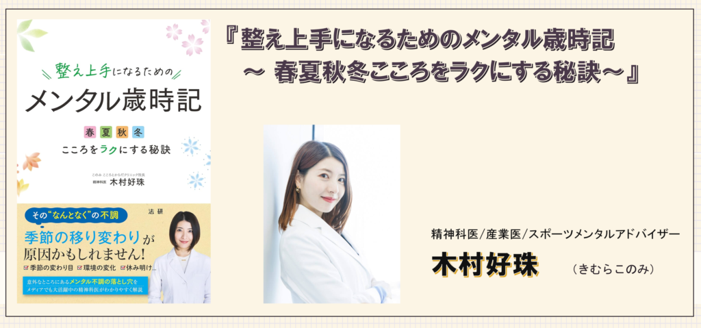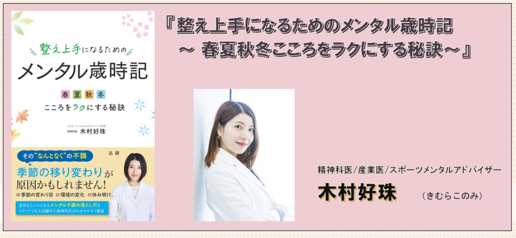 木村好珠さん著書『整え上手になるためのメンタル歳時記 ~ 春夏秋冬こころをラクにする秘訣~』は、そんな“季節性のメンタル変動”に着目し、春・夏・秋・冬それぞれで起こりやすい心の不調と、その整え方を精神科医の視点で解説した一冊です。