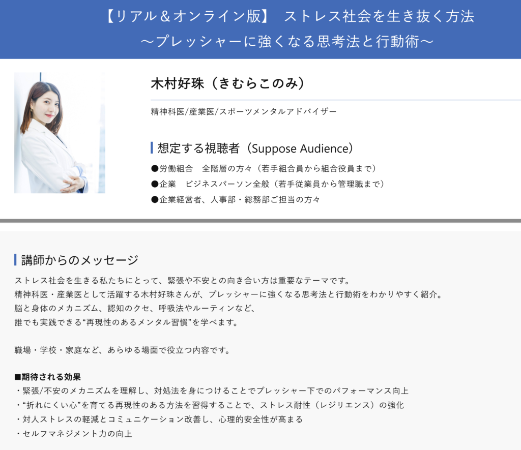 『ストレス社会を生き抜く方法 〜プレッシャーに強くなる思考法と行動術〜』(木村好珠さん)