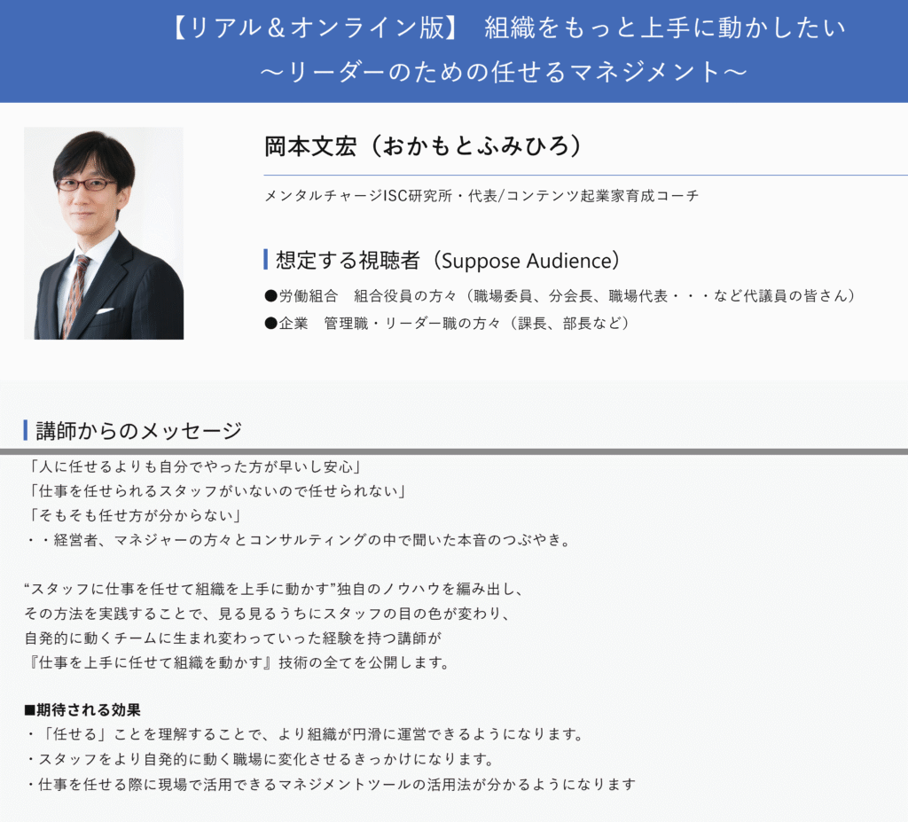 ・単なる理論ではなく、岡本文宏さんご自身の失敗と成功の体験をベースにした実践的な内容が特徴であり、特に「任せることが怖い」と感じているリーダー層にとって、心理的なハードルを乗り越えるヒントが得られると好評でした。