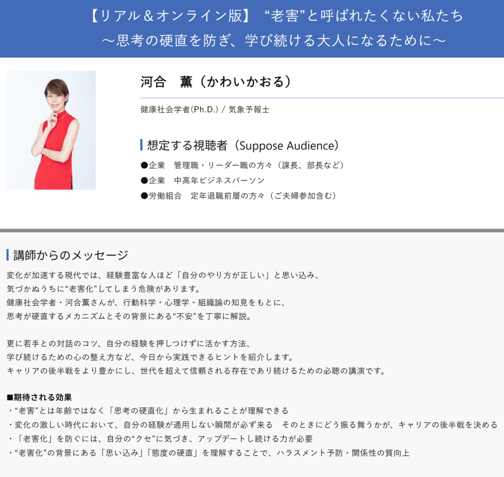 『“老害”と呼ばれたくない私たち 〜思考の硬直を防ぎ、学び続ける大人になるために〜』(河合 薫さん)