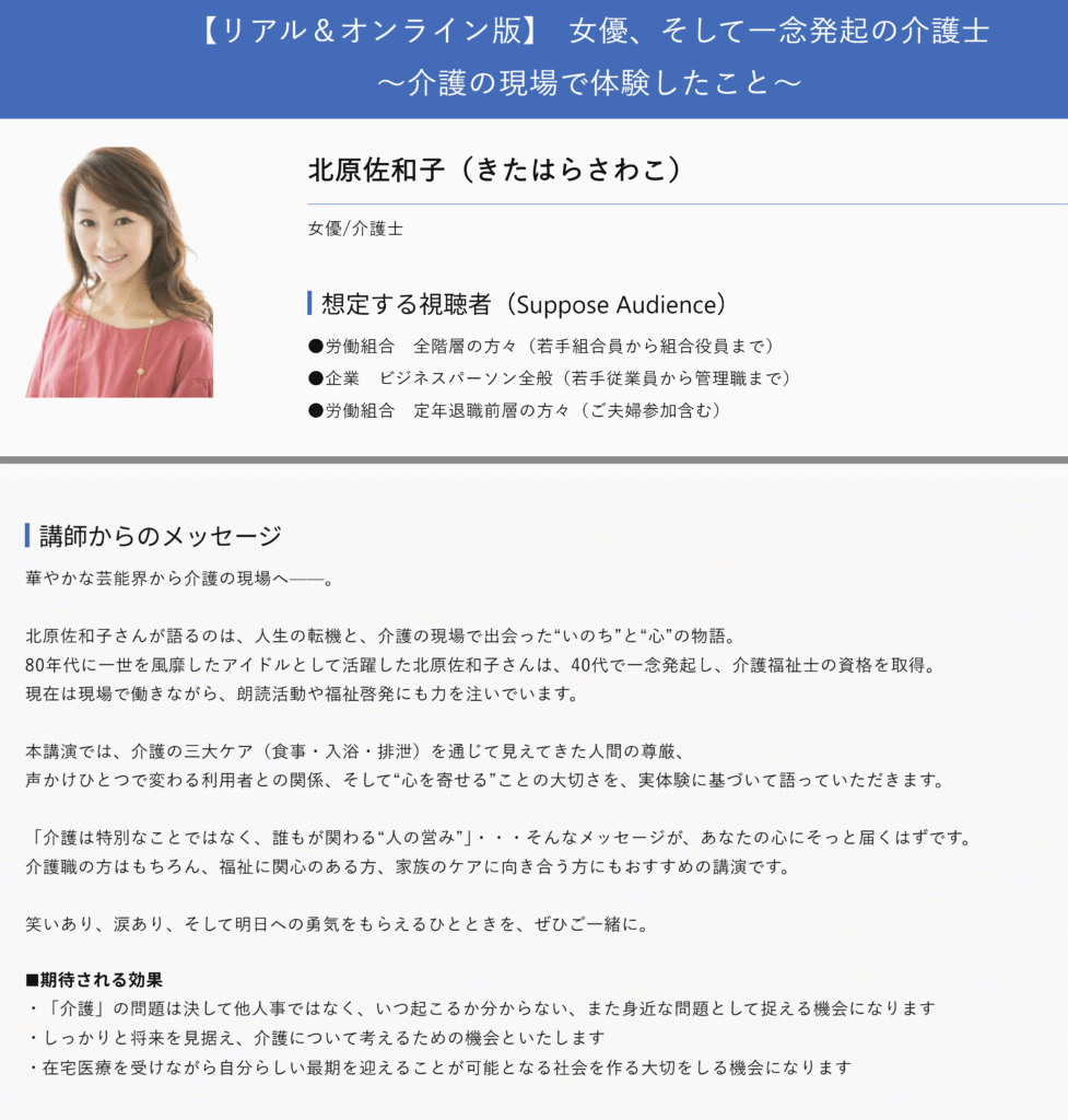 『女優、そして一念発起の介護士 〜介護の現場で体験したこと〜』(北原佐和子さん)