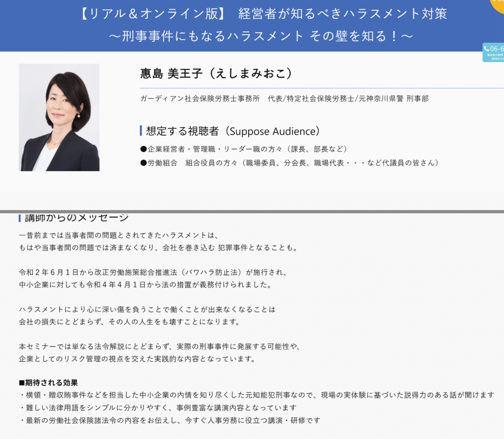 『経営者が知るべきハラスメント対策 〜刑事事件にもなるハラスメント その壁を知る!〜』(惠島美王子さん)