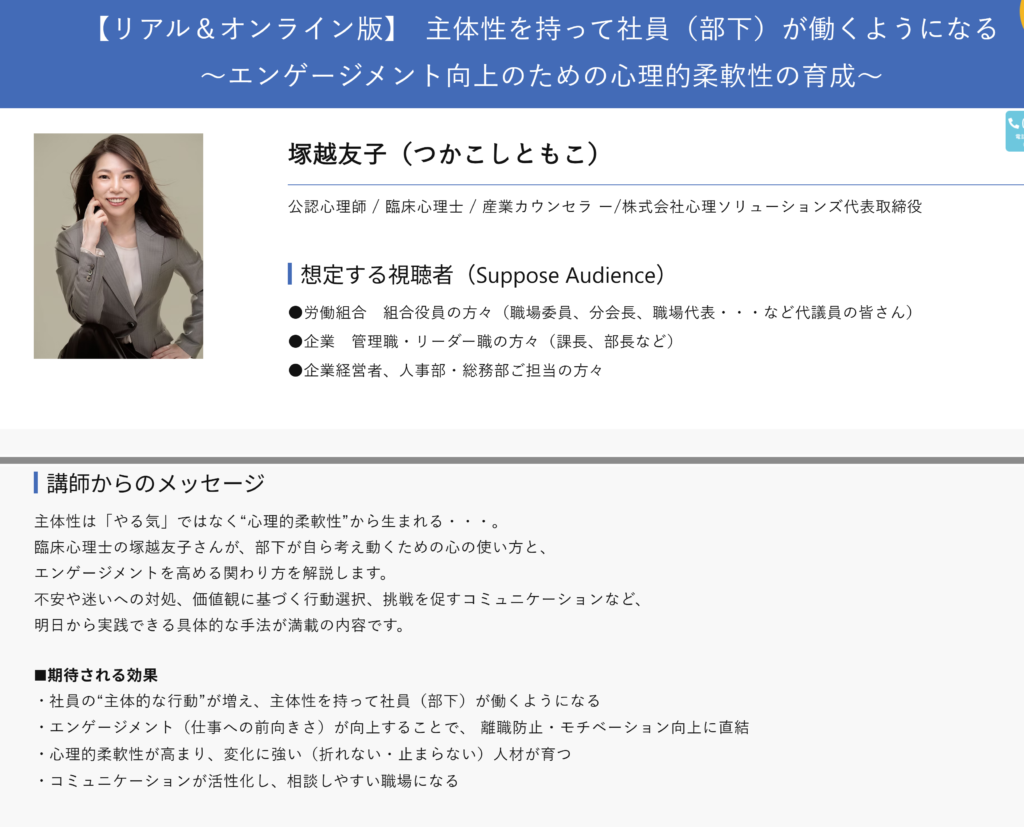『主体性を持って社員(部下)が働くようになる 〜エンゲージメント向上のための心理的柔軟性の育成〜』(塚越友子さん)