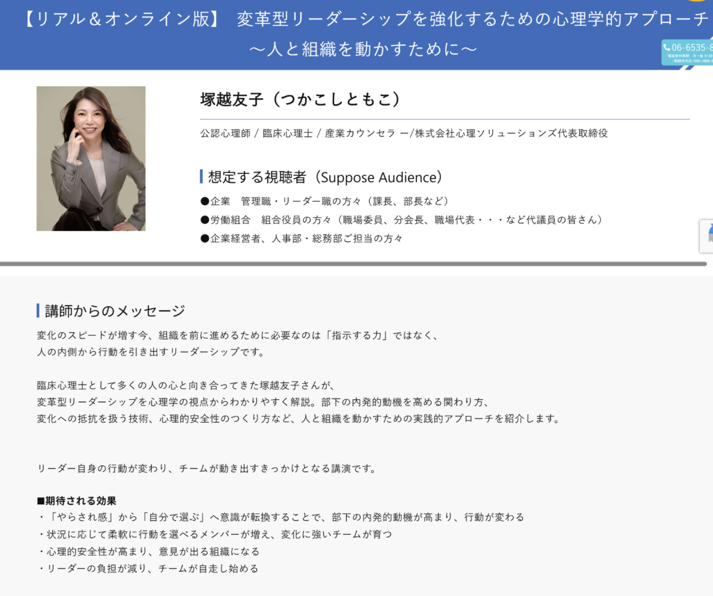 『変革型リーダーシップを強化するための心理学的アプローチ 〜人と組織を動かすために〜』(塚越友子さん)