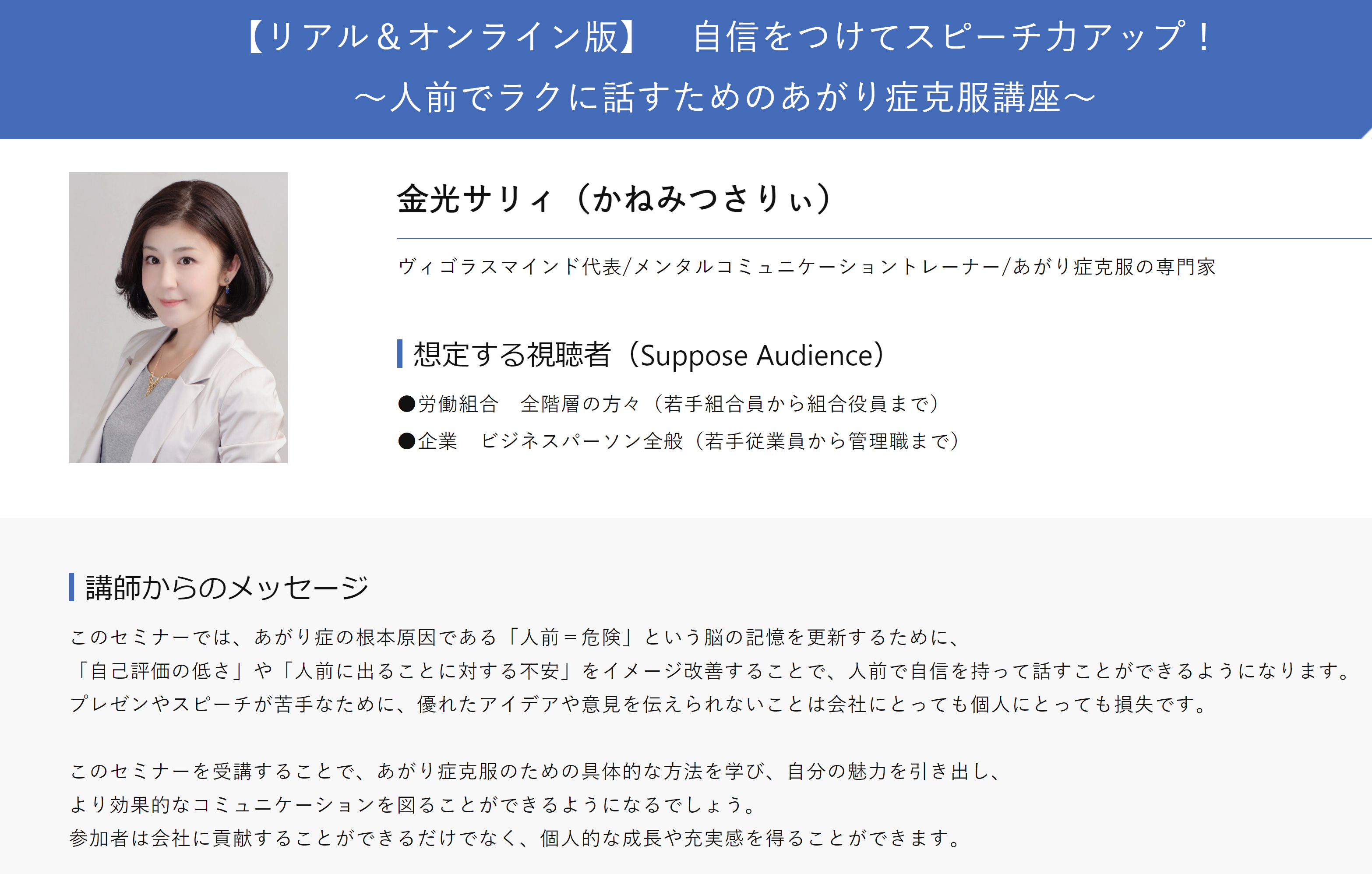 『自信をつけてスピーチ力アップ! ~人前でラクに話すためのあがり症克服講座〜』(金光サリィさん)