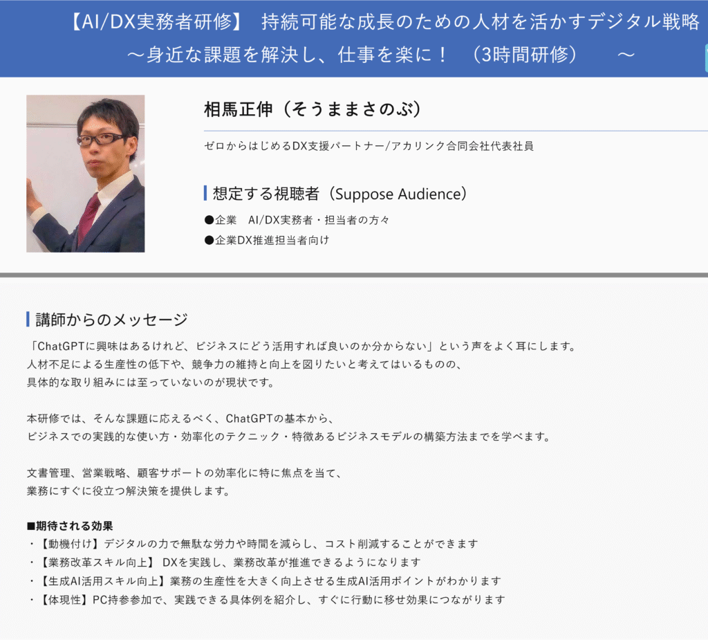 ・中小企業のDX化について、自社だはある程度取り組んでいますが、コンサルタントの仕事の支援先へのサポートが必要だと感じています。3時間研修だけでしたが、もう少し早くわかっていれば、4時間、12時間研修も企業と一緒に参加したかったです。