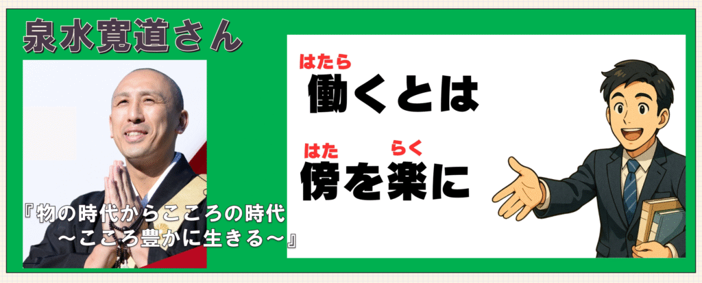 つまり「働く」とは、自分の周りにいる人たちの生活や環境をより快適に、より豊かにすることである・・・と定義づけられます。泉水寛道さんは、利他と自己実現という解釈から「働くこと」の意義を更に深く掘り下げます。