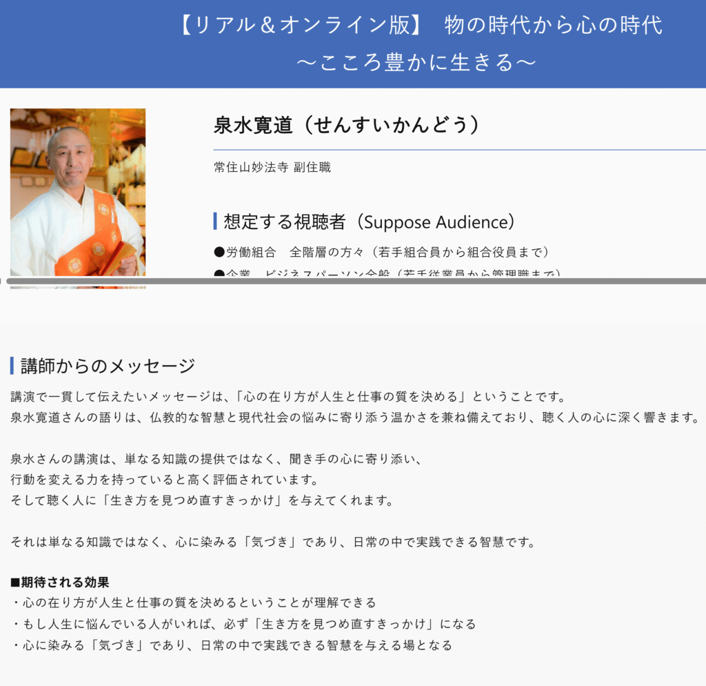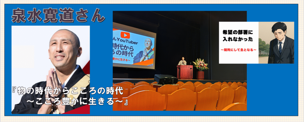 ・・・泉水寛道さんの講演は、単なる知識の提供ではなく、聞き手の心に寄り添い、行動を変える力を持っていると高く評価されています。参加者からは、心に響く深い気づきと、実践的な学びが得られたという感想が多く寄せられています。
