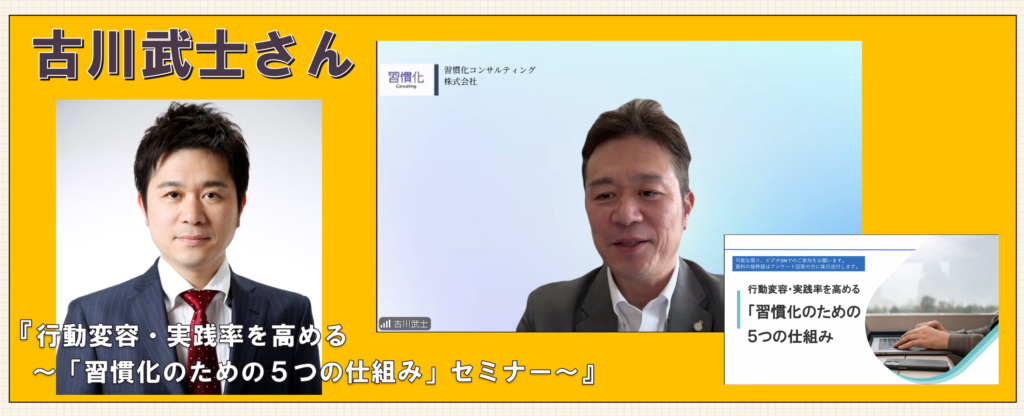行動を変えたいのに続かない――そんな悩みに真正面から応えてくれるのが、古川武士さんの「習慣化の5つの仕組み」セミナー。印象的だったのは、習慣化は“根性”ではなく“仕組み”で決まるという視点でした。