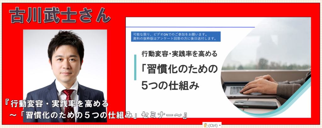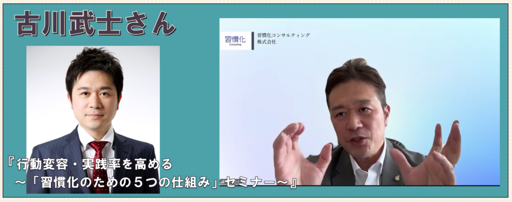・・・などなど、古川武士さんのセミナーでは、行動変容を成功させるための「習慣化の5つの仕組み」を体系的に解説されており、更に脳科学や心理学の知見を交えながら、三日坊主を防ぐ具体的な実践方法や、職場・組織での行動変容を促す仕組みづくりにも触れておられました。