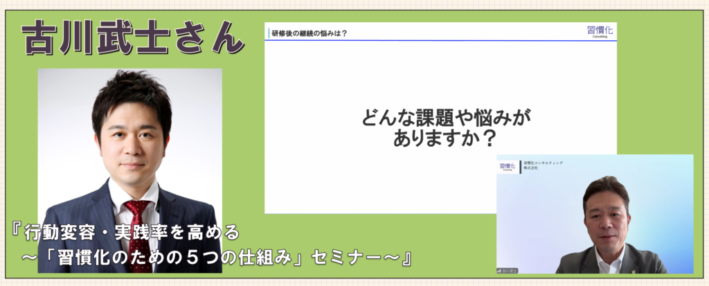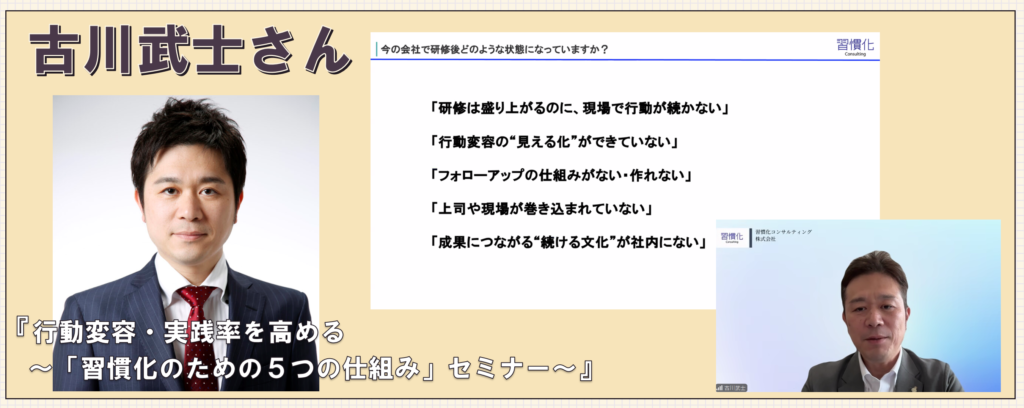 脳科学や心理学の知見も交えながら、職場や日常で実践できる具体策が次々と紹介され、気づけば「明日からやってみよう」と前向きな気持ちに。習慣化の本質を、実践レベルまで落とし込んでくれる濃い内容で、お客さまにも大変ご満足して頂けたオンライン講演でした。
