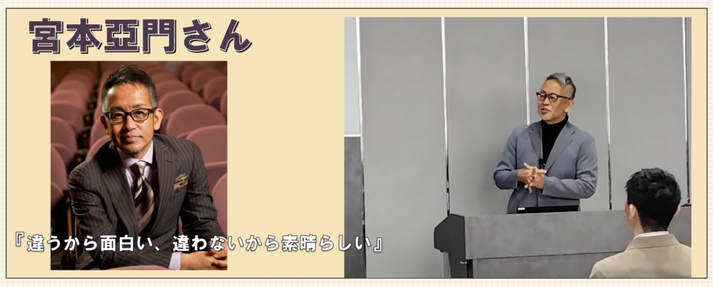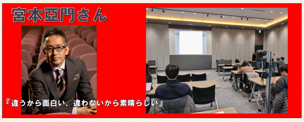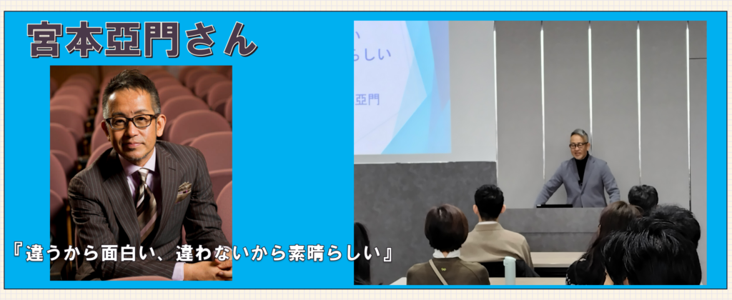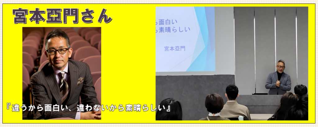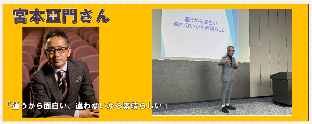 『違うから面白い、違わないから素晴らしい』と題して、宮本亞門さんが演出家として経験されてきたことはもちろんのこと、彼自身の半生と創作の現場で培った“人と向き合う力”を軸に、ご自身の壮絶な?人生経験を通じて、「多様性」「組織の構築」や「チームワーク」をテーマ にご講演いただきました。