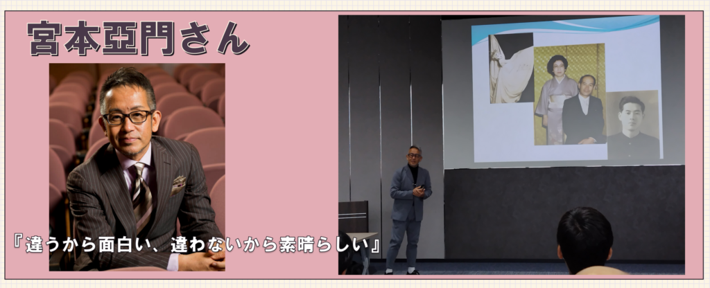 『違う』こと を取り入れることで『面白い』ものを生み出すことができる。そして、そこで生み出される感動は誰も 『違わない』、それは『素晴らしい』ことである、という言葉で締めくくられました。