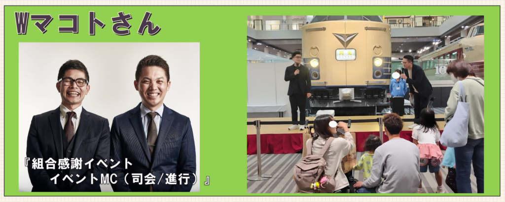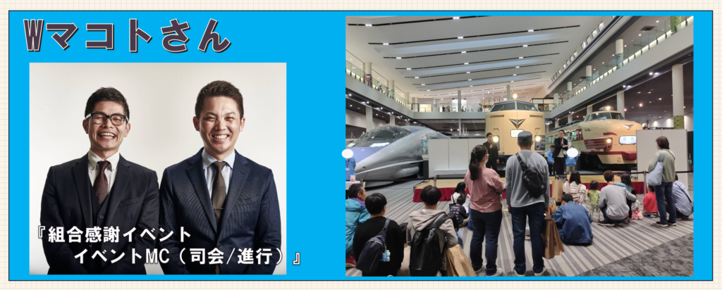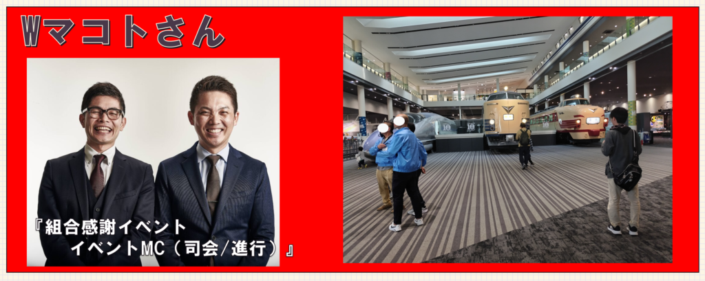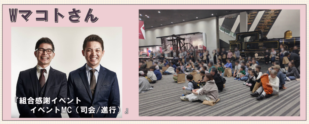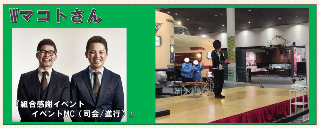 ・・・今回、某物流会社労組さま主催で「組合フェスタ」というレクリエーション事業で、某博物館を貸し切りで行いました。弊社は全体MC/トークコーナーを担うWマコトさんの担当をさせて頂きました。